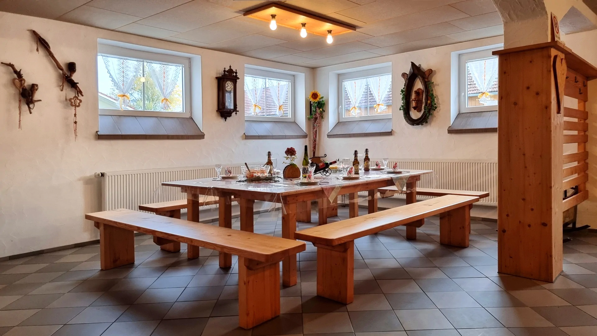 • Essecke mit Tischen und Bänken zum geselligen Beisammensein